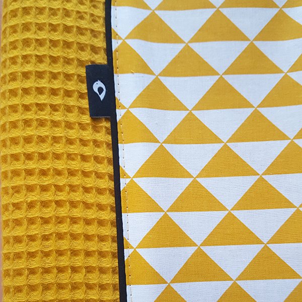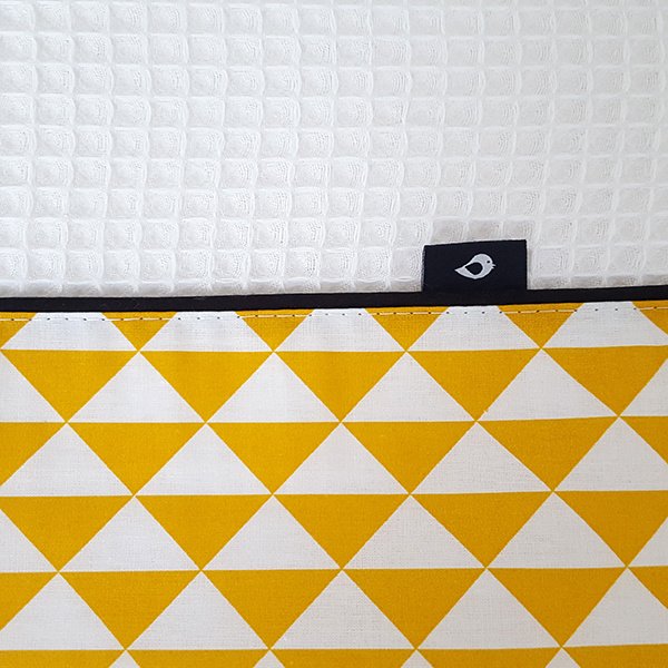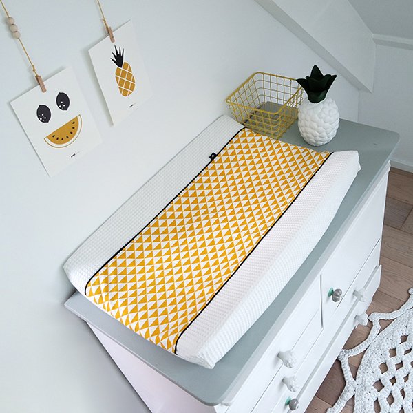 De aankleedkussenhoes okergeel past om een standaard aankleedkussen. Superleuk om de commode op de babykamer hip mee aan te kleden. De overgang van de wafelstof naar de okergele driehoekstof is afgezet met een zwart biesje. Deze okergele aankleedkussenhoes met wafelstof is van 100% katoen en daardoor gewoon te wassen! Zoek je een ander printje? We hebben nog veel meer aankleedkussenhoezen!