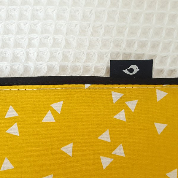 De aankleedkussenhoes okergeel met driehoekjesprint is gemaakt voor een standaard maat aankleedkussen. Superleuk om het aankleedkussen op de commode hip mee aan te kleden. De overgang van de wafelstof naar de okergele triangelstof is afgezet met een zwart biesje. Deze aankleedkussenhoes okergeel met wafelstof is van 100% katoen en daardoor gewoon te wassen!