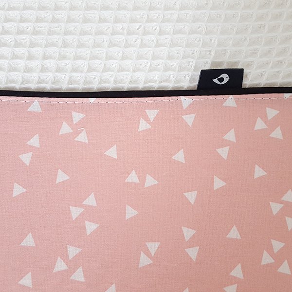 De roze aankleedkussenhoes met driehoekjes is superleuk om de commode op de babykamer mee aan te kleden. Voor een hippe meisjeskamer! De overgang van de wafelstof naar de roze triangelstof is afgezet met een zwart biesje. Deze waskussenhoes in het roze met wafelstof is van 100% katoen en daardoor gewoon te wassen! De roze aankleedkussenhoes past om het standaard formaat aankleedkussen. Combineer de hoes met een mooie ledikantdeken.