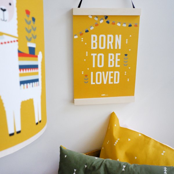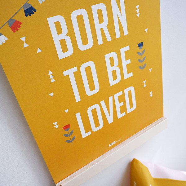 Leuke poster met de tekst “Born to be loved”, mooi okergeel voor de moderne babykamer. De poster is goed te combineren met onze andere producten!