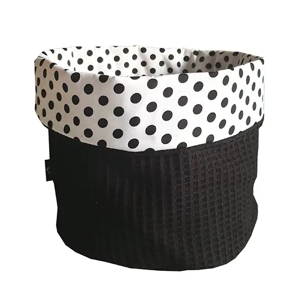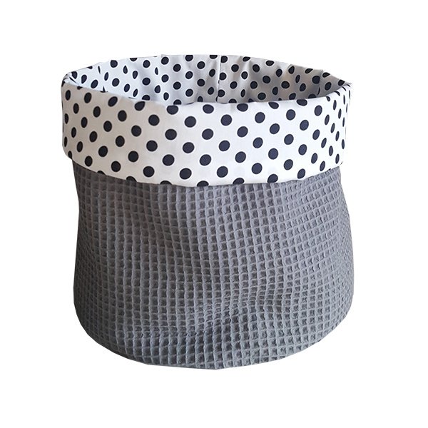 Superleuk commodemandje wafelstof in combinatie met hippe stippenprint. Dit mandje past goed op de commode zodat je er luiers en/of andere producten in kwijt kunt. Het staat ook vooral erg leuk :). Je kunt het goed mixen en matchen met onze aankleedkussenhoezen, dekens en andere producten. De kleur wafelstof kun je zelf kiezen, je kunt kiezen uit: