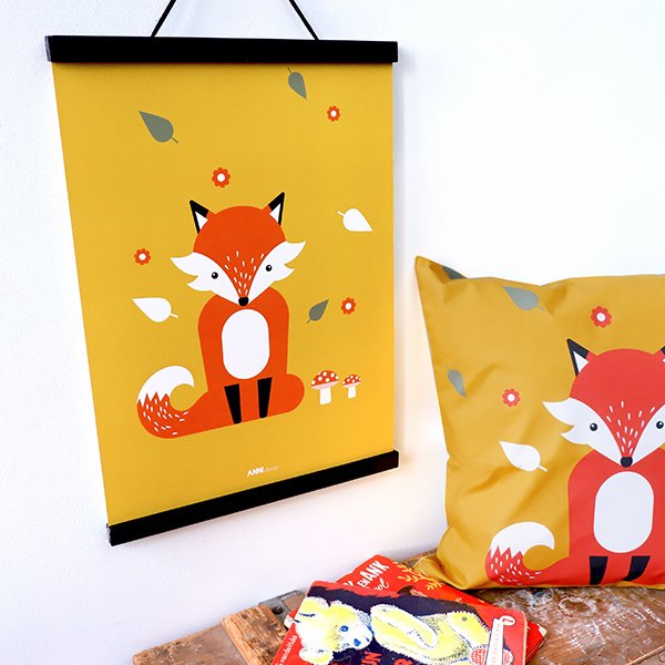Het schattige vosje wordt omringd door blaadjes en paddenstoelen en de basiskleur is okergeel. We hebben verschillende andere producten in oker waarmee je de babykamer geweldig aan kunt kleden. Je vindt hier dus niet alleen een dierenposter voor je kinderkamer maar nog veel meer mooie producten!
