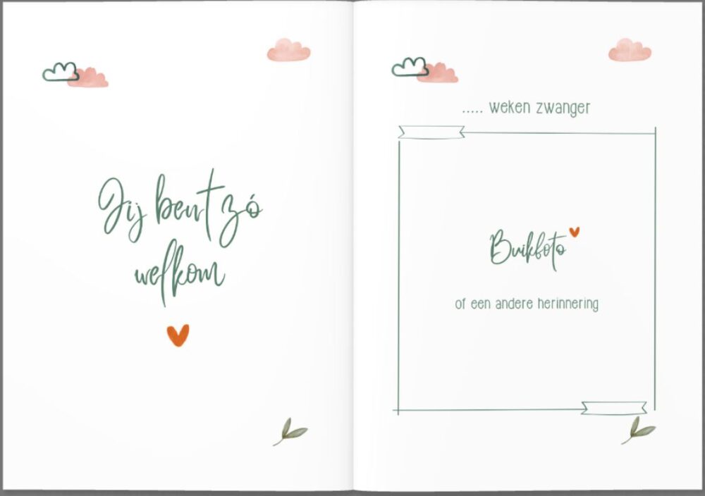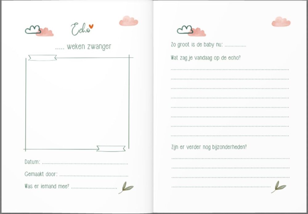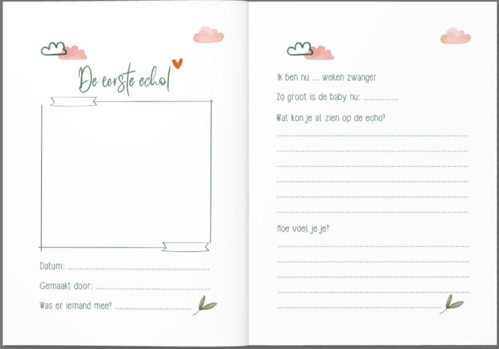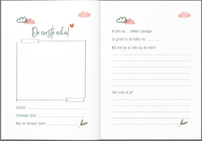 Het boekje begint met een kort stukje over mama. Vervolgens is er plek om de allereerste echofoto in te plakken en te schrijven over deze echo. Hierna zijn er nog 2 pagina’s om extra foto’s van deze echo in te plakken. Daarna komt de volgende echo aan bod. Na de eerste 2 echo’s is er een dagboekgedeelte (2 pagina’s) met een aantal vragen en vervolgens is er ruimte voor een buikfoto of iets anders dat je wilt delen (het kamertje, of de eerste kleertjes bijvoorbeeld). Dit herhaalt zich 8 keer, zodat je uitgebreid kunt schrijven over 8 echo’s (de dagboekvragen wijzigen elke keer) en er is veel ruimte om foto’s in te plakken. Toch niet genoeg ruimte? Achterin het boekje vind je nog eens 8 pagina’s waar je foto’s kwijt kunt. Uiteraard zijn er ook 2 pagina’s waarop je de gegevens van je kindje kunt schrijven en een foto van na de geboorte in kunt plakken.
