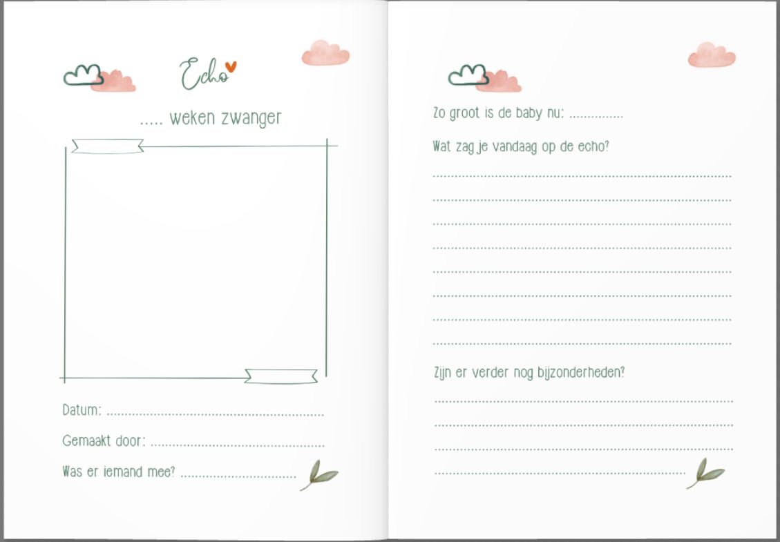 Dit echoboekje gebruik je om alle echofoto’s in te bewaren! Handig, zo raak je ze niet kwijt en het is een mooi aandenken aan je zwangerschap. In dit echo boekje hou je de echofoto’s bij elkaar en schrijf je over je zwangerschap. De weken zijn niet vooraf ingevuld omdat iedereen op een ander moment een echo heeft. De een heeft ook meer echo’s dan de ander, in dit boekje kun je ze in ieder geval allemaal kwijt!
