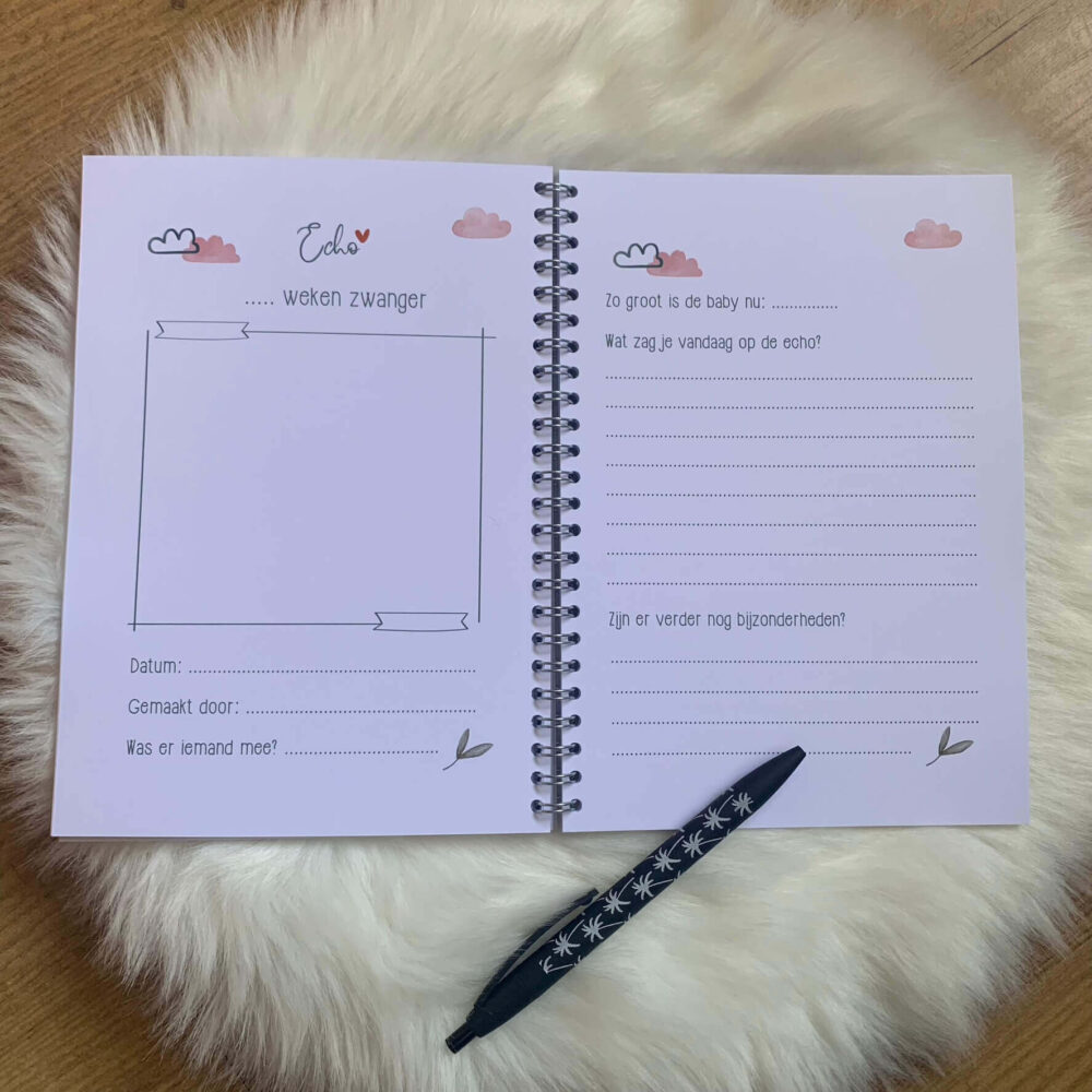 - Het echoboekje is wire-o-gebonden. Door deze spiraalbinding zal het boekje niet beschadigen als er veel foto’s ingeplakt zijn