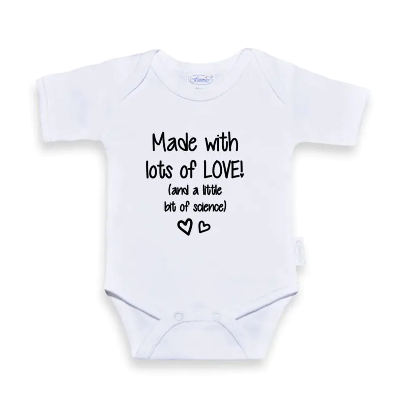 Het katoenen rompertje Hallo oom en tante is er in maat 50/56 en heeft korte mouwtjes.