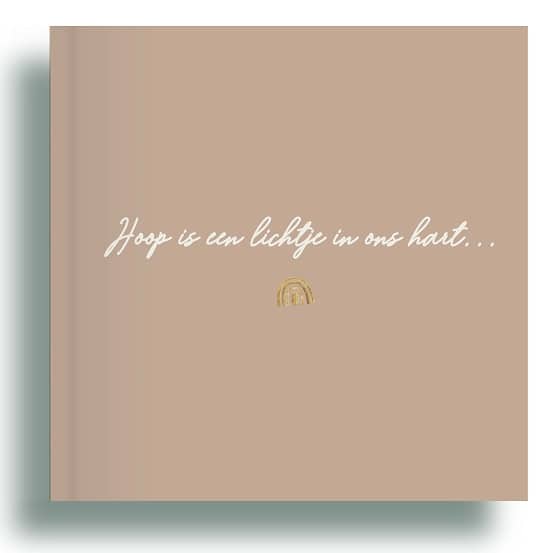 Het koffertje met de tekst “Hoop is een lichtje in je hart…” waar je de kinderwens spulletjes in kunt bewaren is gemaakt van stevig karton en heeft een metalen handvat en andere metalen details.