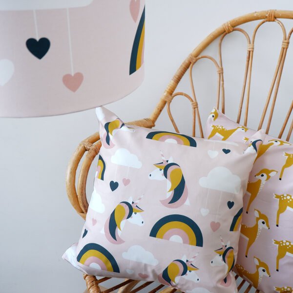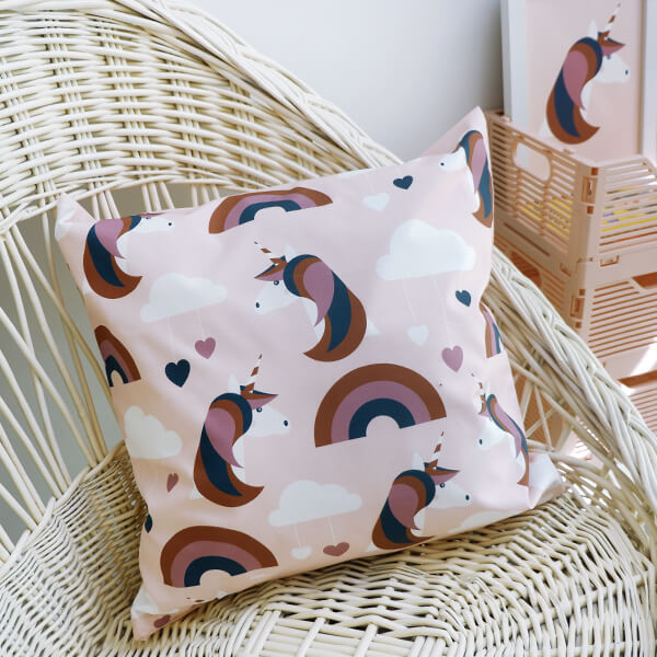 Unicorn alarm! Ben jij eenhoorn fan? Of is je meisje helemaal gek van eenhoorns? Dan is dit roze kussen onmisbaar voor haar kamer! Unicorn kussen met aan de ene kant een grote eenhoorn en roze achtergrond, aan de andere kant heel veel eenhoorns!