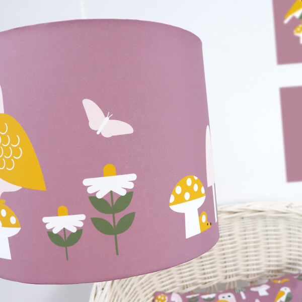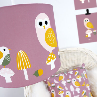 De lamp bosdieren voor de babykamer, een geweldige toevoeging aan het assortiment! Deze schattige lamp met een uitje, vogel en paddestoelen in de trendy kleur oud paars staat enorm leuk in elke babykamer, maar is ook een leuke lamp voor de kinderkamer!