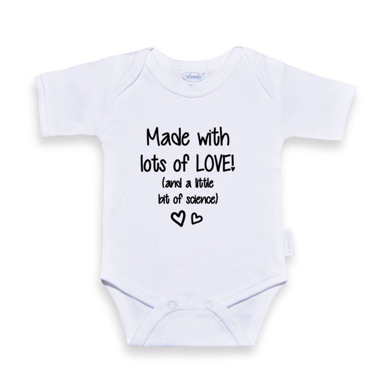 Het rompertje met de tekst “Made with lots of love (and a little bit of science), voor de baby waar je zo lang op hebt moeten wachten en hard voor hebt moeten vechten.