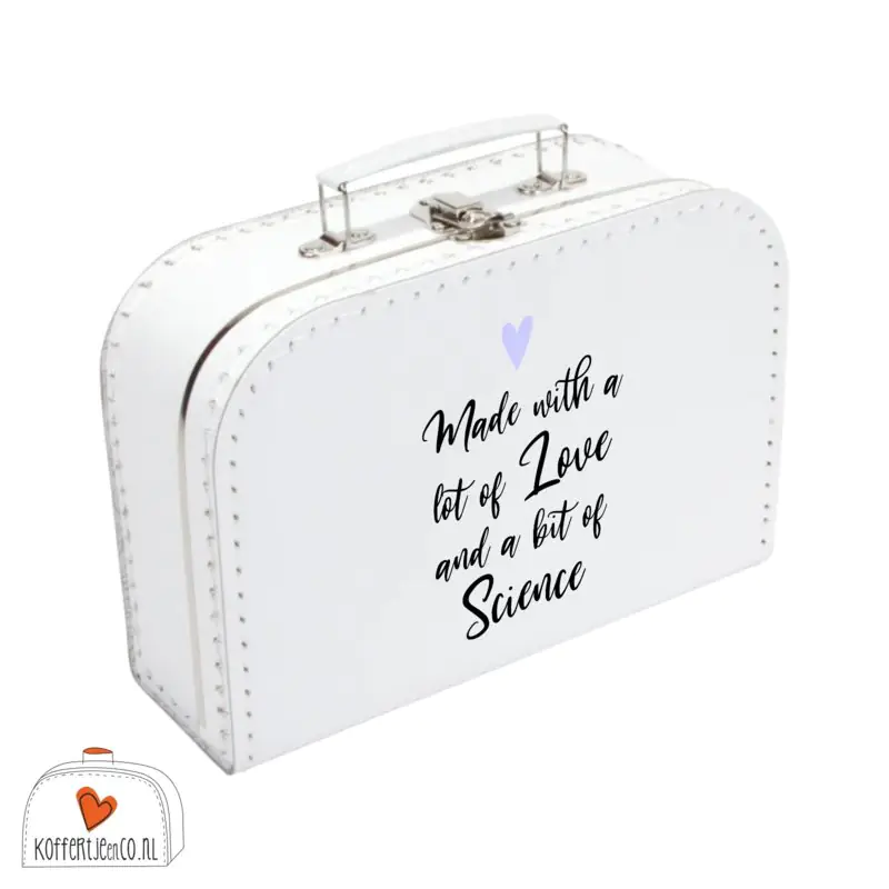 Mooi koffertje met de tekst: “Made with a lot of love and a bit of science” waarin je alle spulletjes van je fertiliteitstraject kunt bewaren. Ben je bezig of ga je beginnen met IVF, ICSI, IUI of een ander fertiliteitstraject en zoek je een manier om elk aandenken op weg naar een kindje te bewaren? Alle spuiten, echo’s, kinderwens mijlpaalkaarten en andere zaken. De een gooit ze het liefst meteen weg, maar de ander geeft ze graag een plekje. Hiervoor kun je dit koffertje gebruiken zodat je alle spulletjes uit je traject op een mooie plek kunt bewaren.