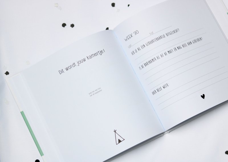 Het invulboek voor tijdens de zwangerschap heeft een linnen hardcover in een mooie zandkleur, de binnenkant is geheel in het zwart wit en bestaat uit 82 pagina’s. De afmeting van het zwangerschapsdagboek is 21 x 21 cm.