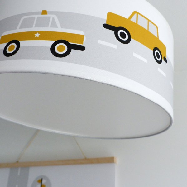 Kleur: Grijs met okergeel-zwarte voertuigen op een witte achtergrond. De lamp is afgewerkt met een witte band. De print op de plafondlamp bestaat uit verschillende voertuigen die erg leuk staan in de kinderkamer en waar veel kinderen dol op zijn: Onder andere een taxi, graafmachine en vrachtwagen!