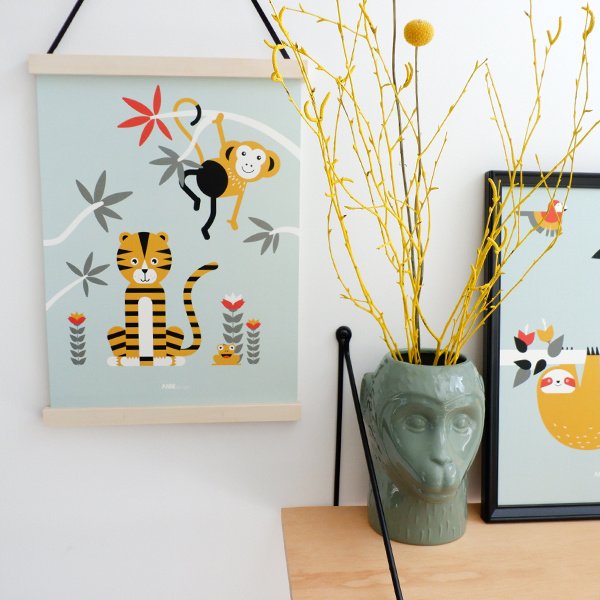 Deze kinderkamer poster is supervrolijk, met een aapje en tijger. Leuk te combineren met de andere producten uit het jungle thema! Kies bijvoorbeeld een leuk bijpassend kussen en een lamp voor de kinderkamer. Met een paar producten creëer je meteen een vrolijke sfeer in de kinderkamer!