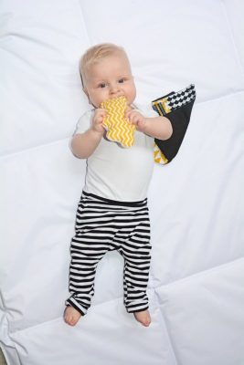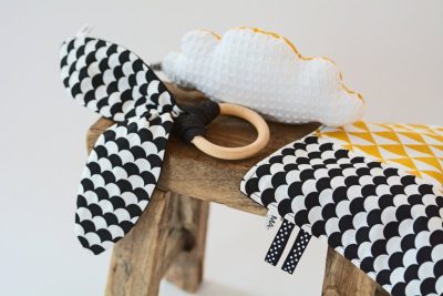 De hippe rammelaar okergeel is aan de voorkant gemaakt van de leuke okergele zigzag stof en aan de achterkant van de populaire wafelstof (wit).
