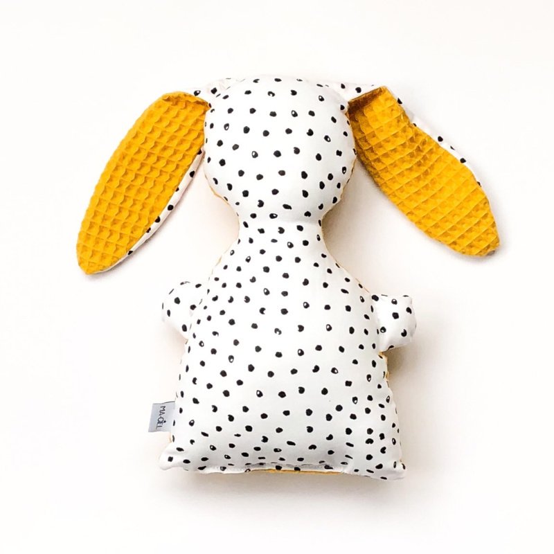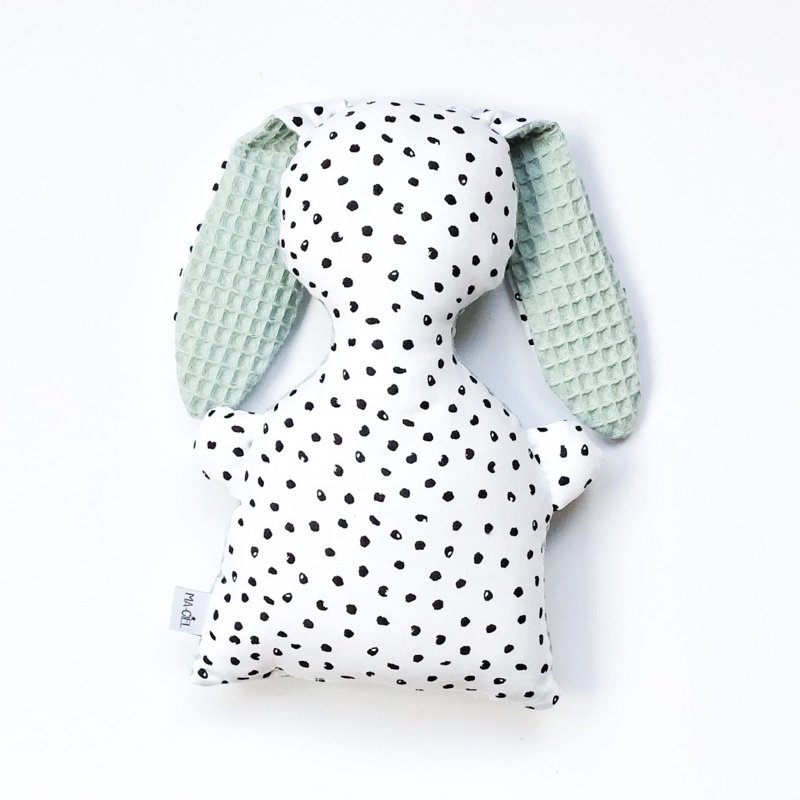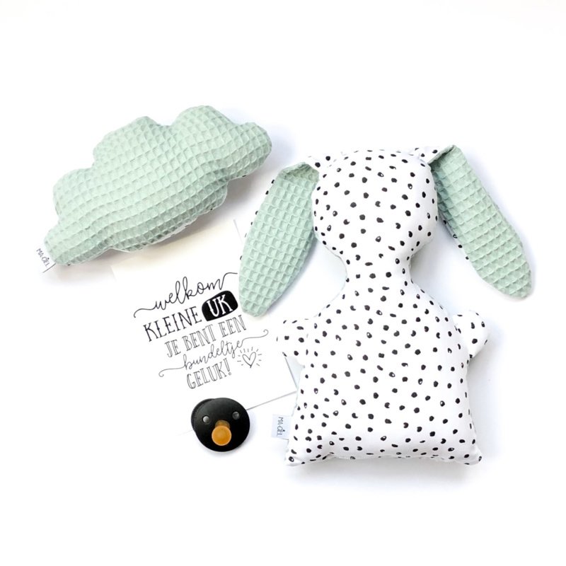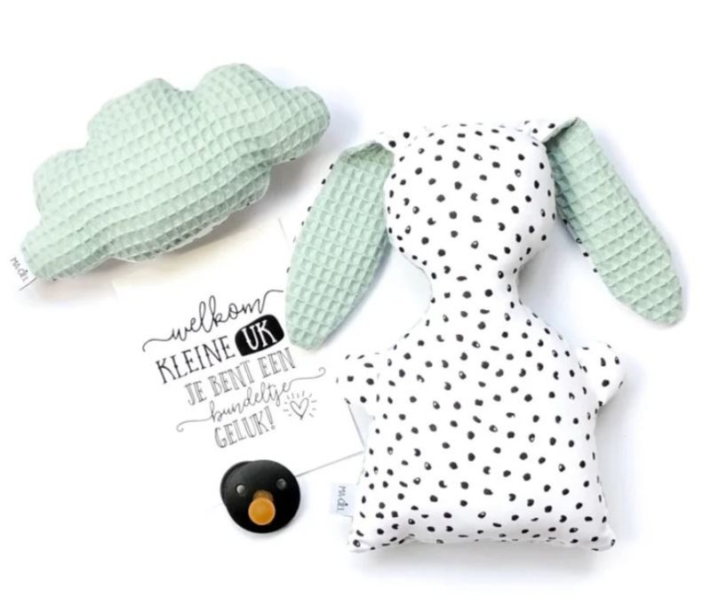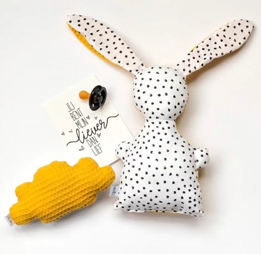 De rammelaar wolk is gemaakt van leuke witte katoenen stof met zwarte stipjes in combinatie met wafelstof naar keuze in okergeel, poedergroen of oud roze.