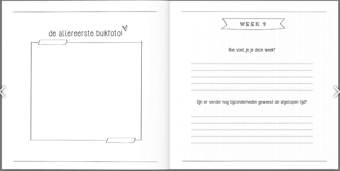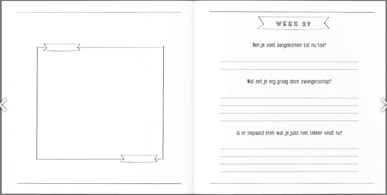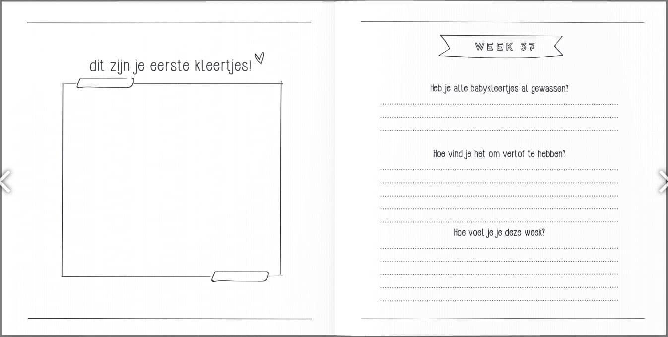 Het zwangerschapsboek heeft een linnen (hard)cover, de binnenkant is geheel in het zwart wit en bestaat uit 82 pagina’s. De afmeting van het zwangerschapsdagboek is 21 x 21 cm.