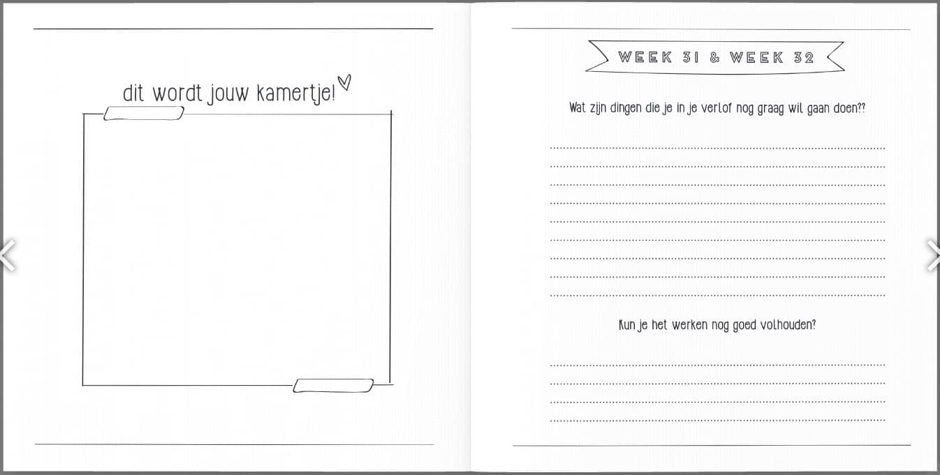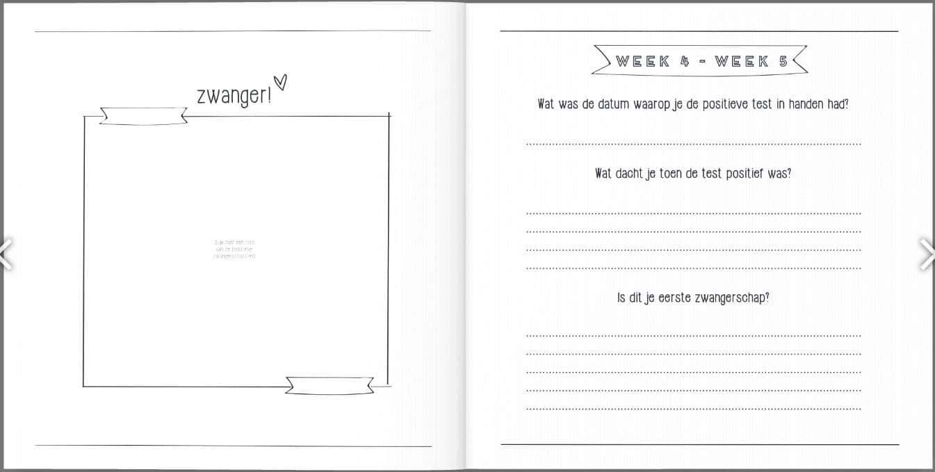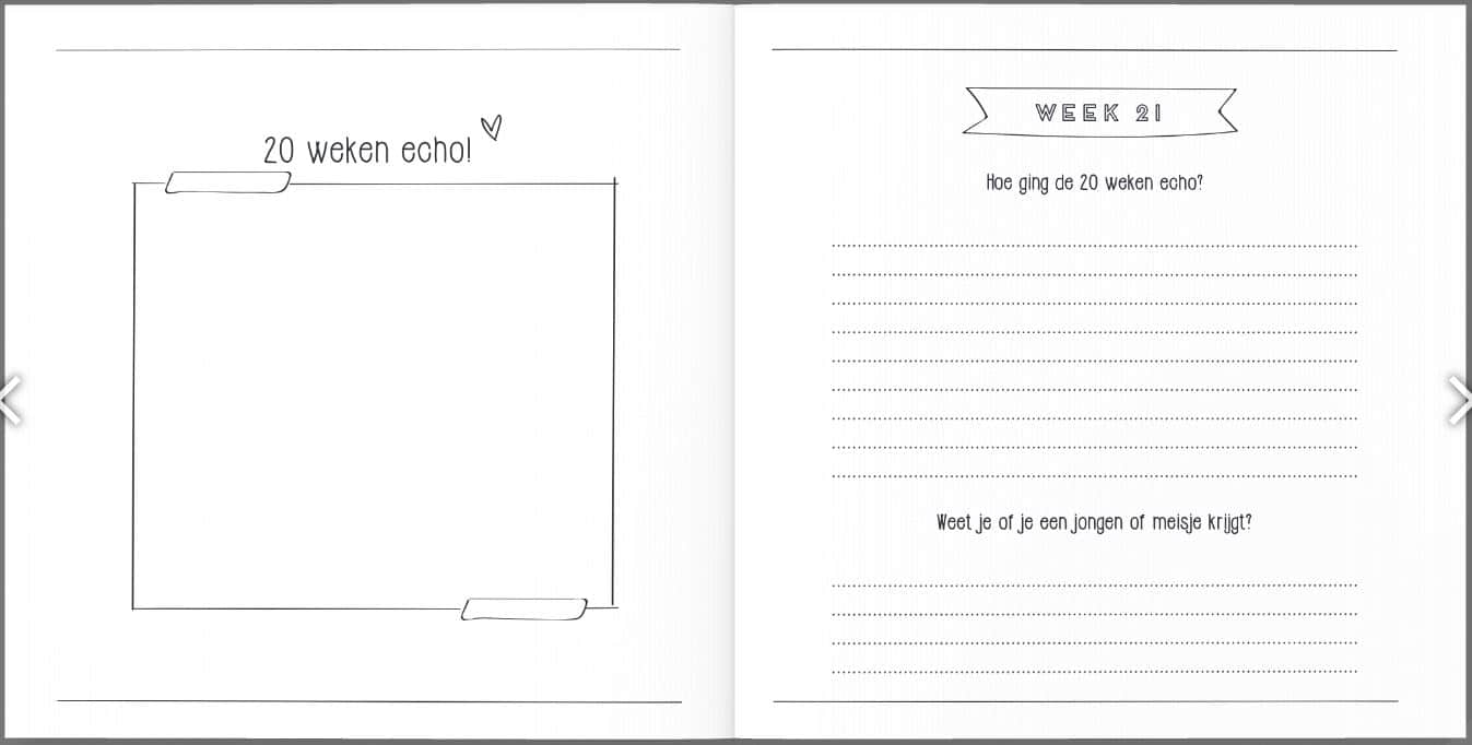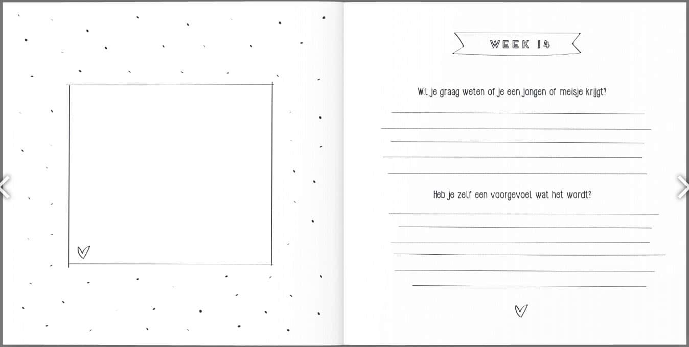 Het zwangerschapsboek heeft een linnen (hard)cover, de binnenkant is geheel in het zwart wit en bestaat uit 82 pagina’s. De afmeting van het zwangerschapsdagboek is 21 x 21 cm.