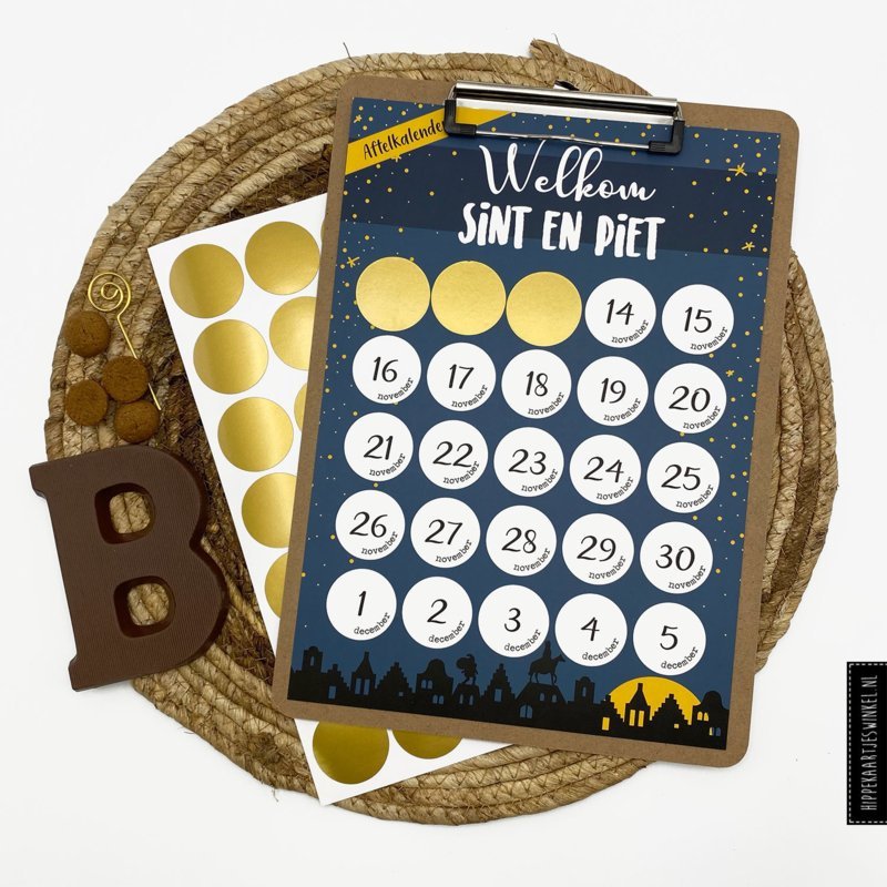 De Sinterklaas aftelkalender is afgedrukt op A4 papier en wordt geleverd met een klembord en 25 gouden stickers